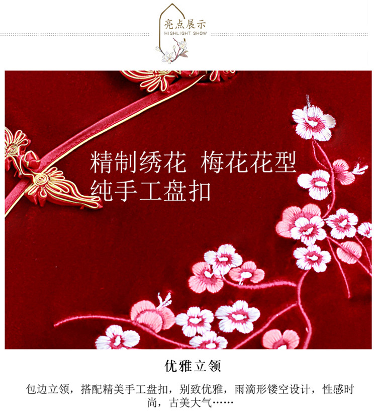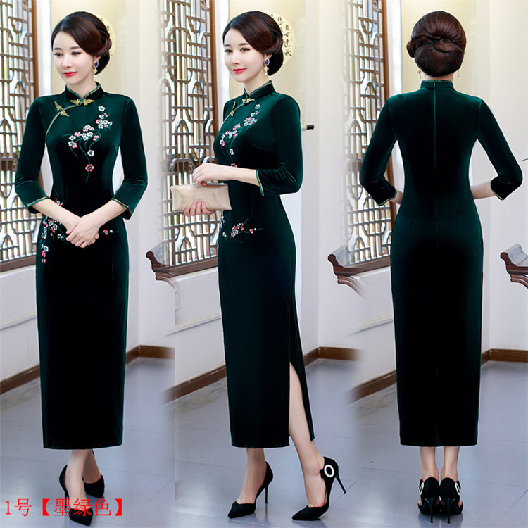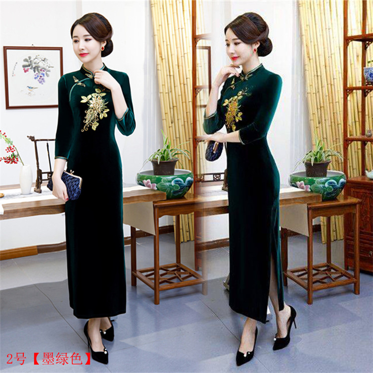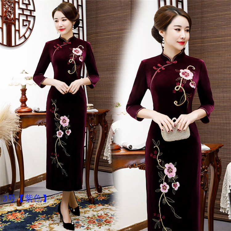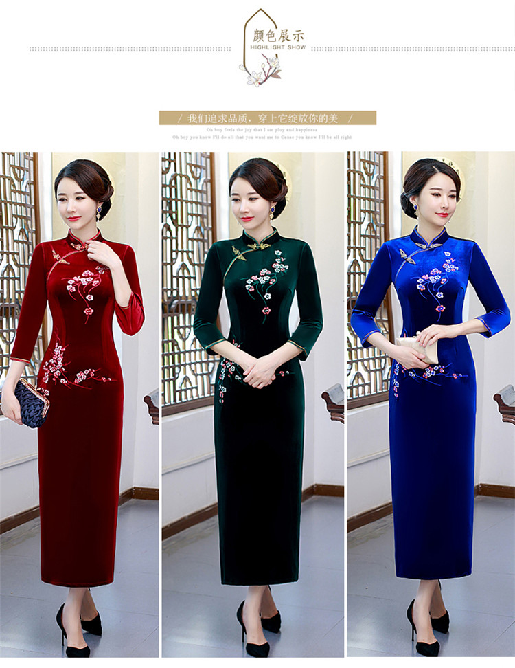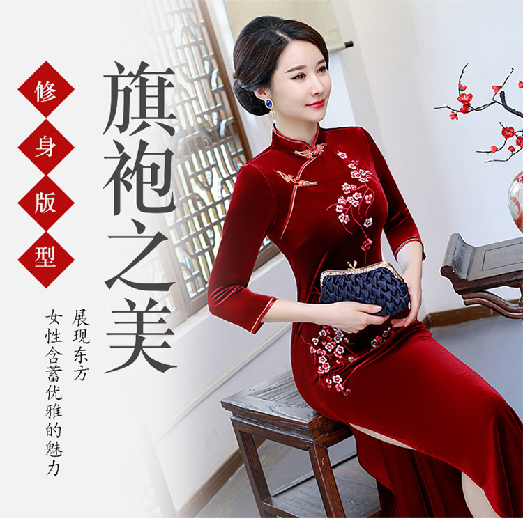 • Red clothing, warm cheongsam, retro velvet long dress for mother, with embroidery