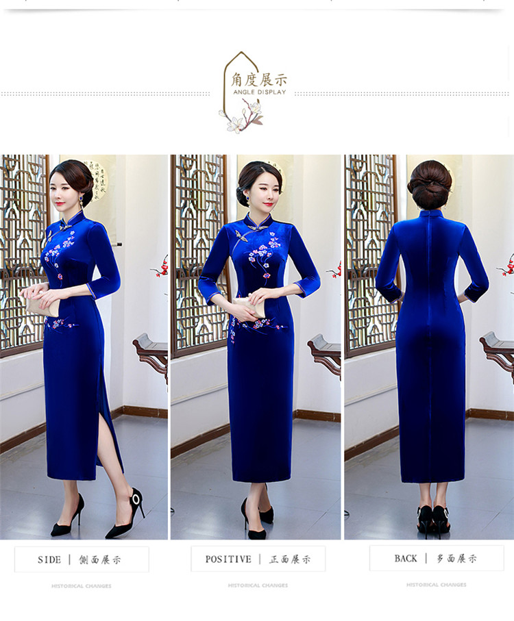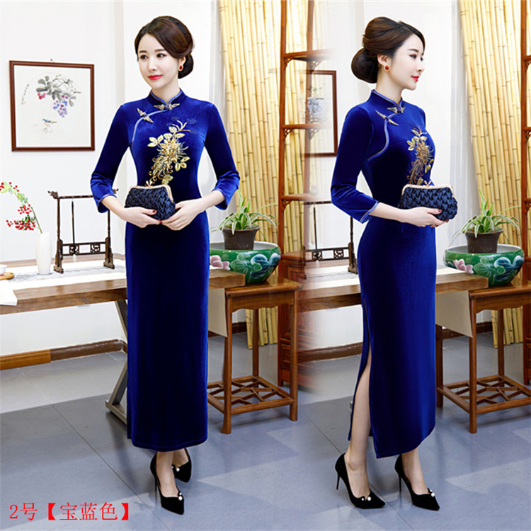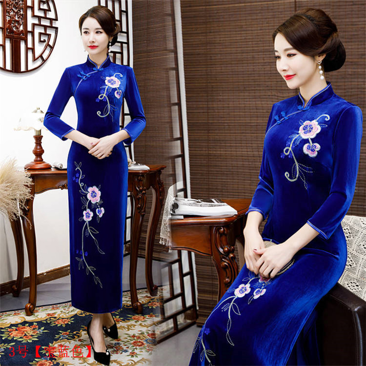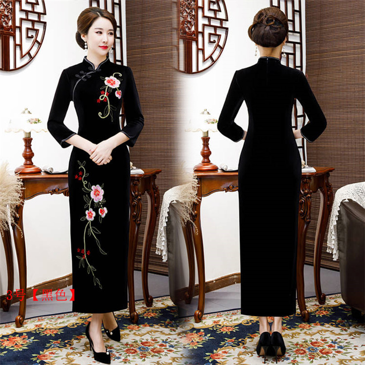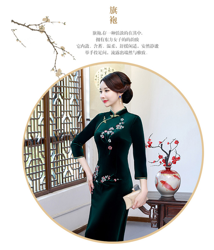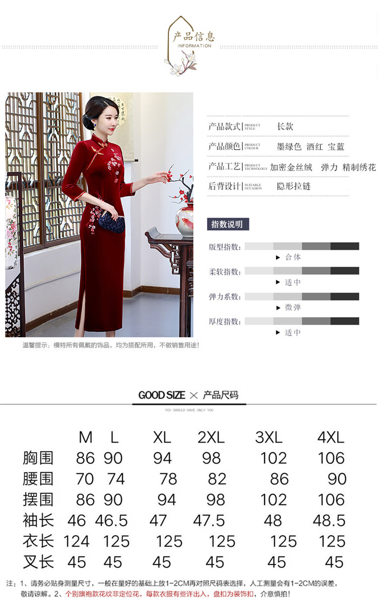 • Red clothing, warm cheongsam, retro velvet long dress for mother, with embroidery