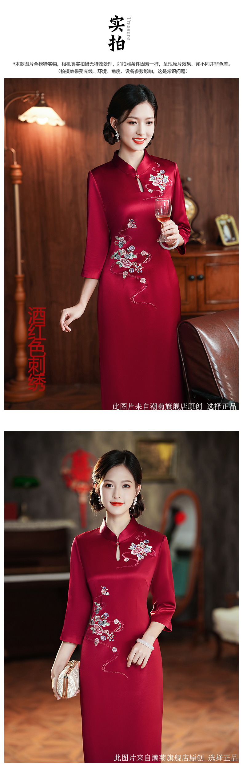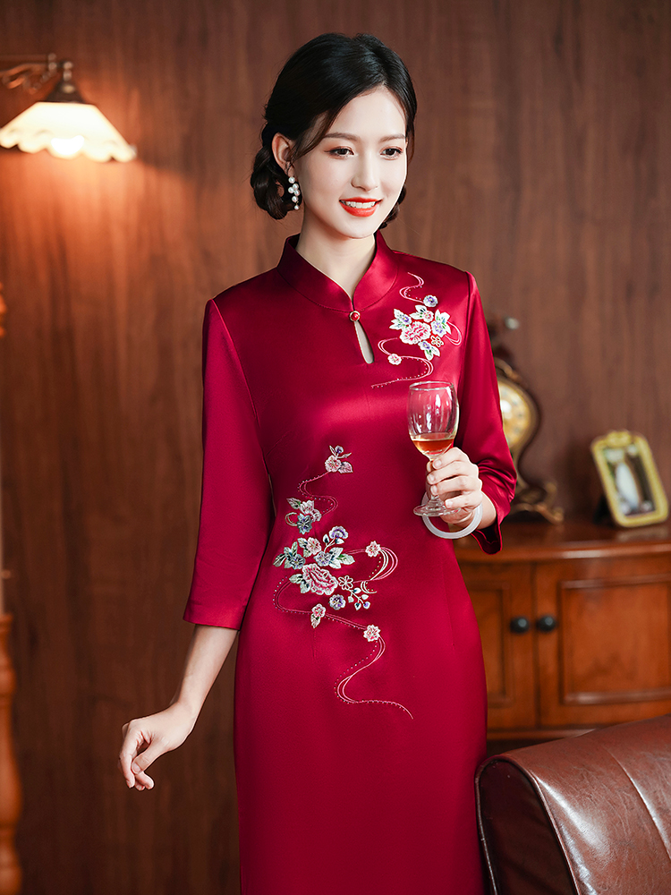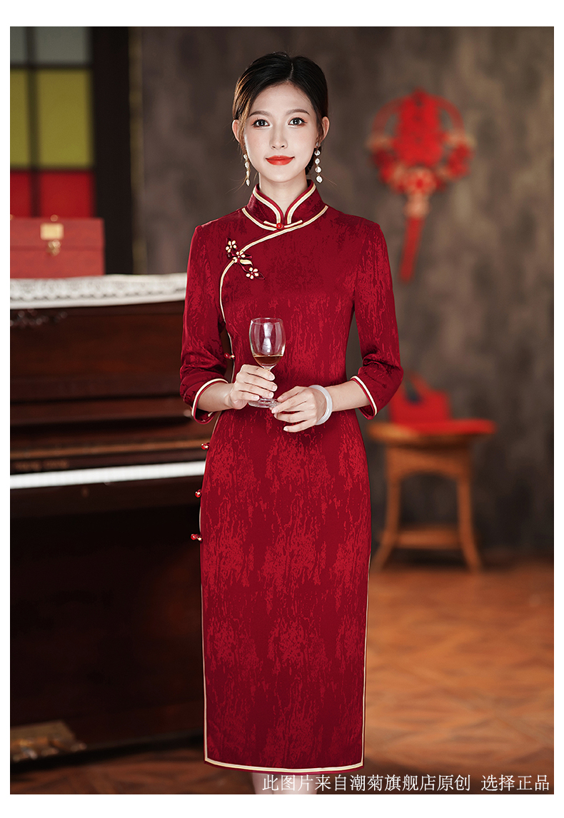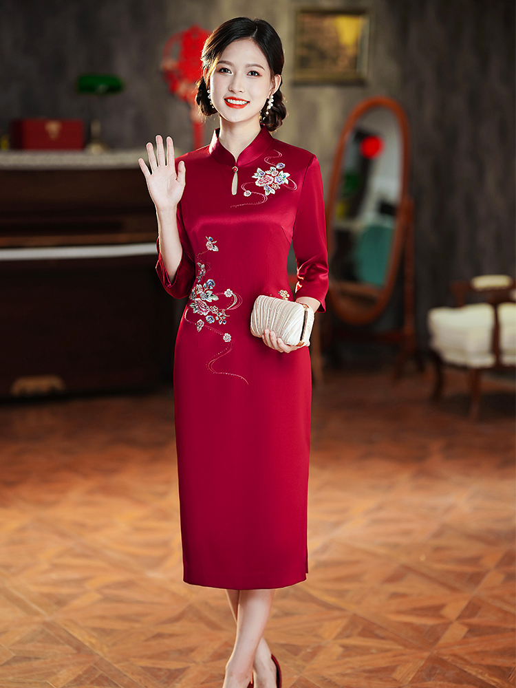 Burgundy, with embroidery;Burgundy, with embroidery, with short sleeve;Wine red water droplet collar;Burgundy, with short sleeve;Bluster red nails in the middle sleeve;Blower red butterfly love flower SMS;Peacock blue nails seven -point sleeve;Burgundy, mid length, long sleeve;Burgundy, mid length, long sleeve;Blushing Jiuzhu Flower;Blushing plate flower buckle short sleeves;Burgundy colour circle, mid length, long sleeve;Bluster red flower buckle short sleeve;Burgundy, mid length, long sleeve