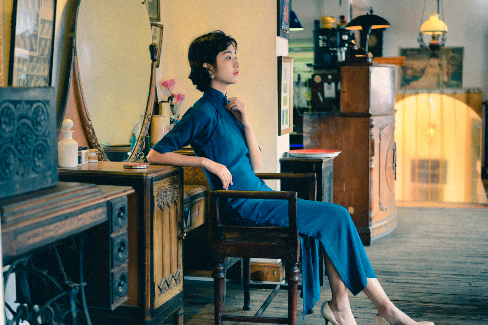 The meaning of flat shoulders is that the shoulder is out of line. In actual wearing, it is necessary to form the shoulder lines from the individual's shoulder oblique condition, so there will be wrinkles under the armpit.This fold restores the temperament of the old cheongsam, and it is also a style that cheongsam fans are very willing to try.