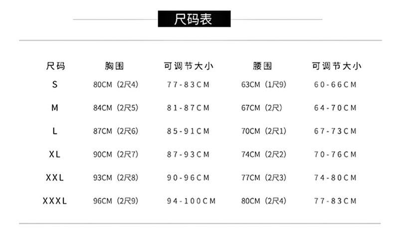 S-waist circumference 1.9 feet-about 90 catties weight;M-waist circumference 2.0 feet-about 100 catties weight;L-waist circumference 2.1 feet-about 110 catties weight;XL-waist circumference 2.2 feet-about 120 catties of weight;XXL-waist circumference 2.3 feet-about 130 catties of weight;XXXL-waist circumference 2.4 feet-about 140 catties of weight;For tailor customization, please contact customer service without refunding