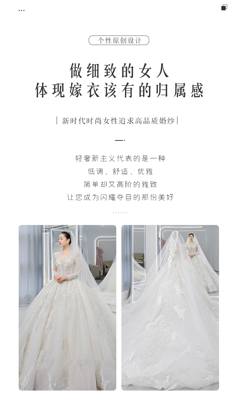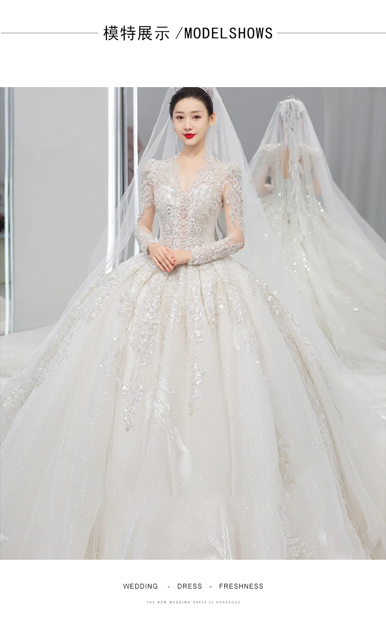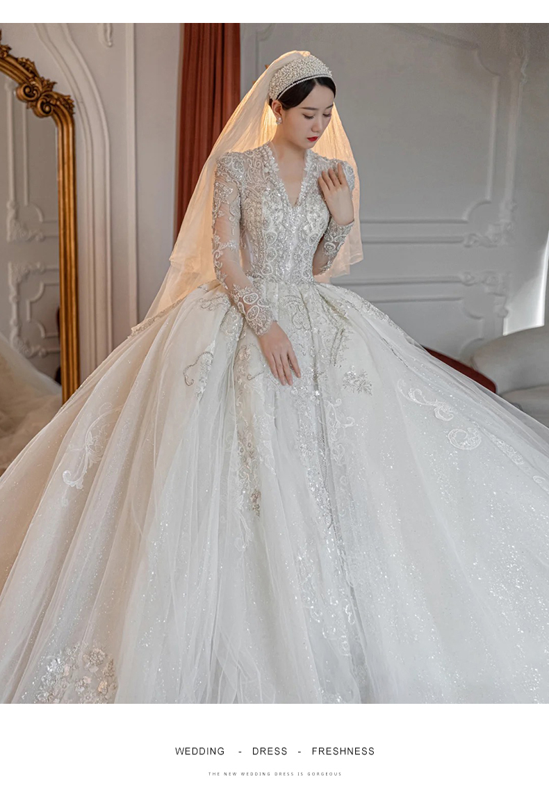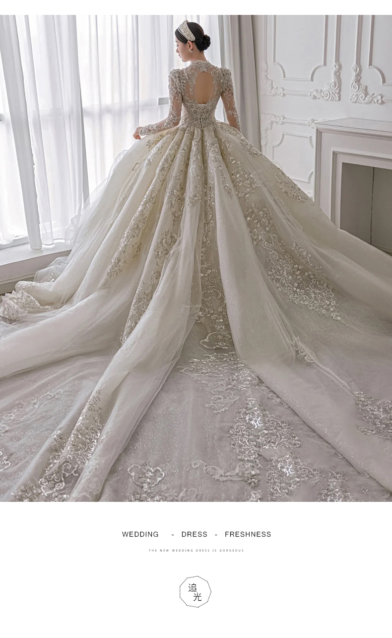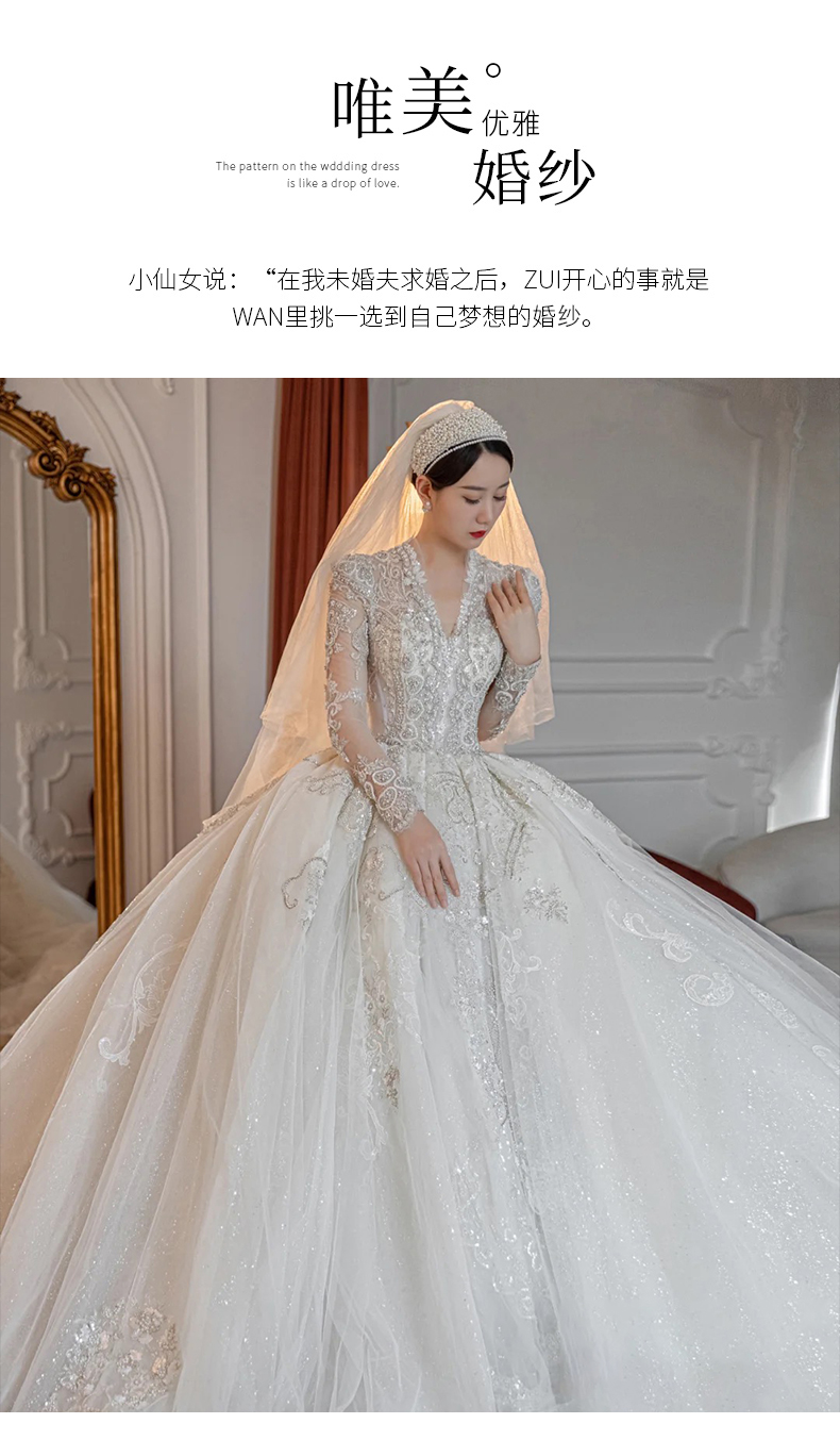 • Long -sleeved light wedding dress 2023 new bride temperament, small, high -level sensor, luxury large trailer main gauze texture