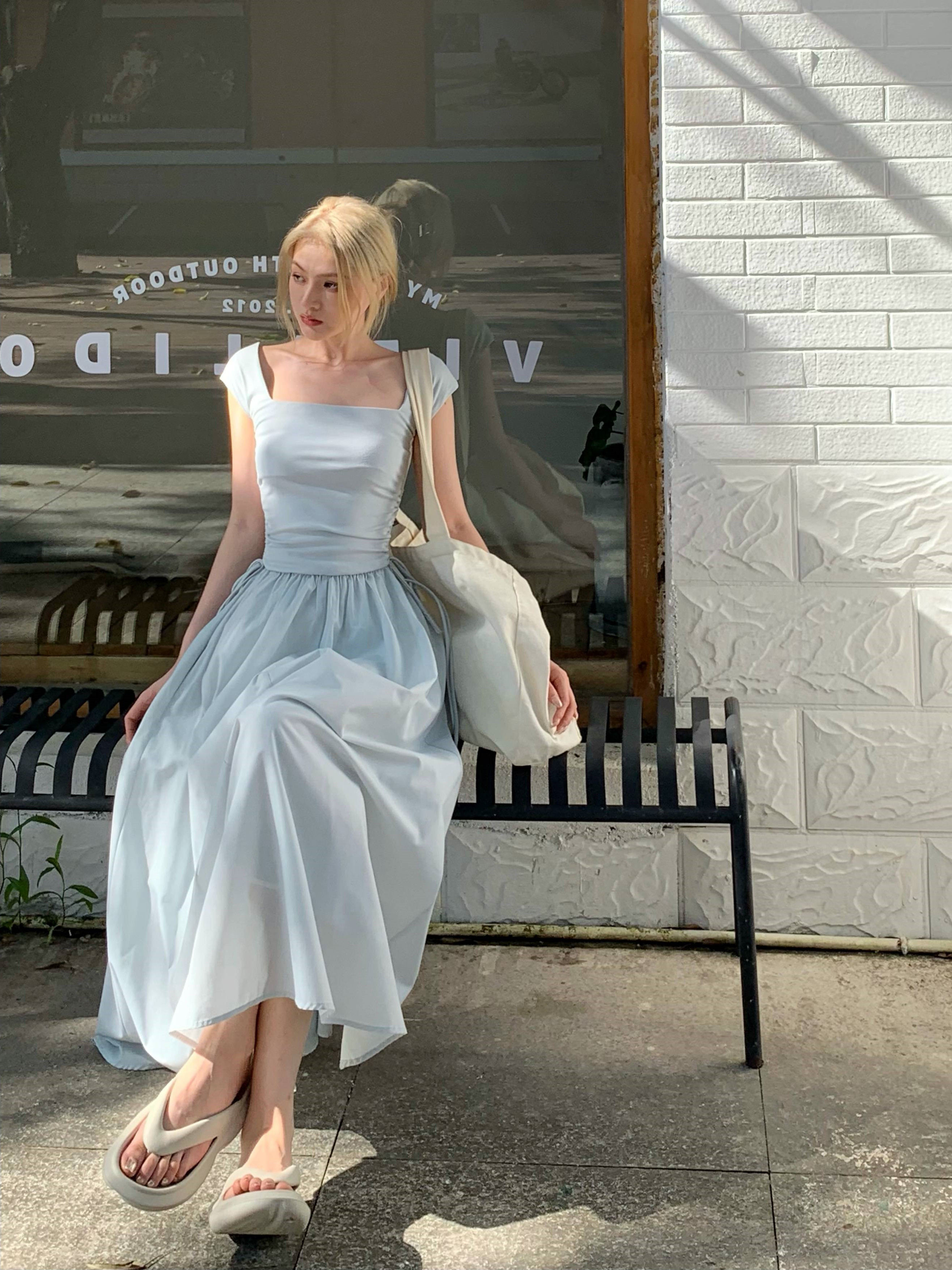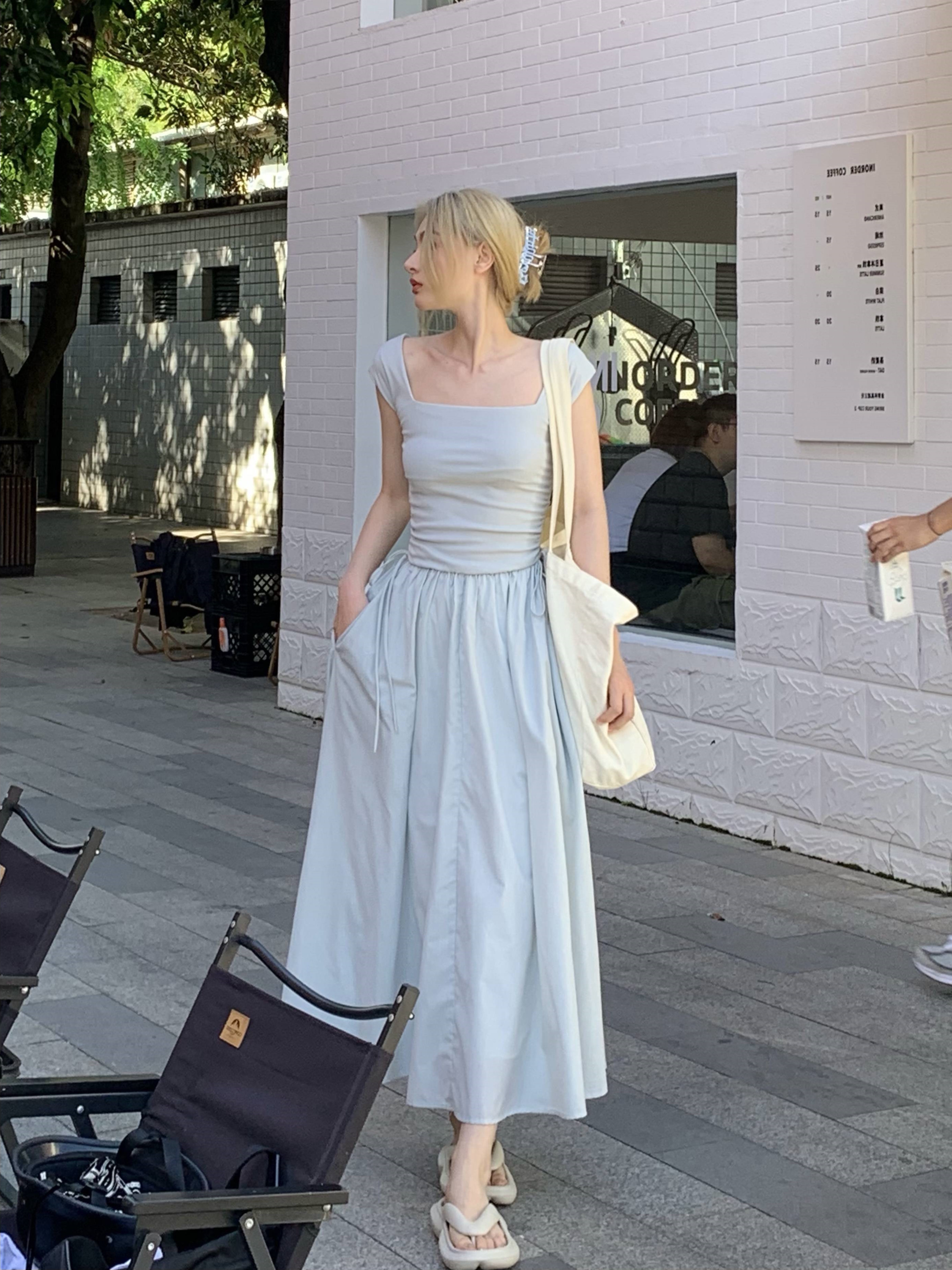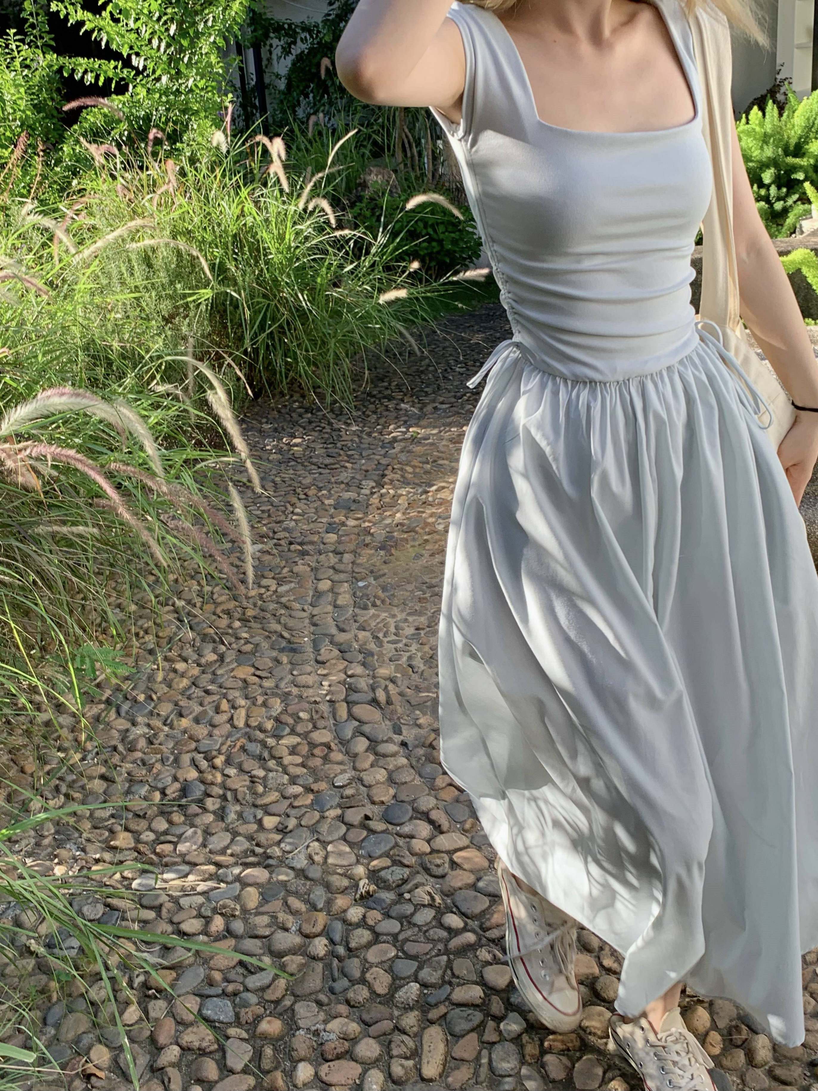 Gray -blue waist sleeveless;White brace