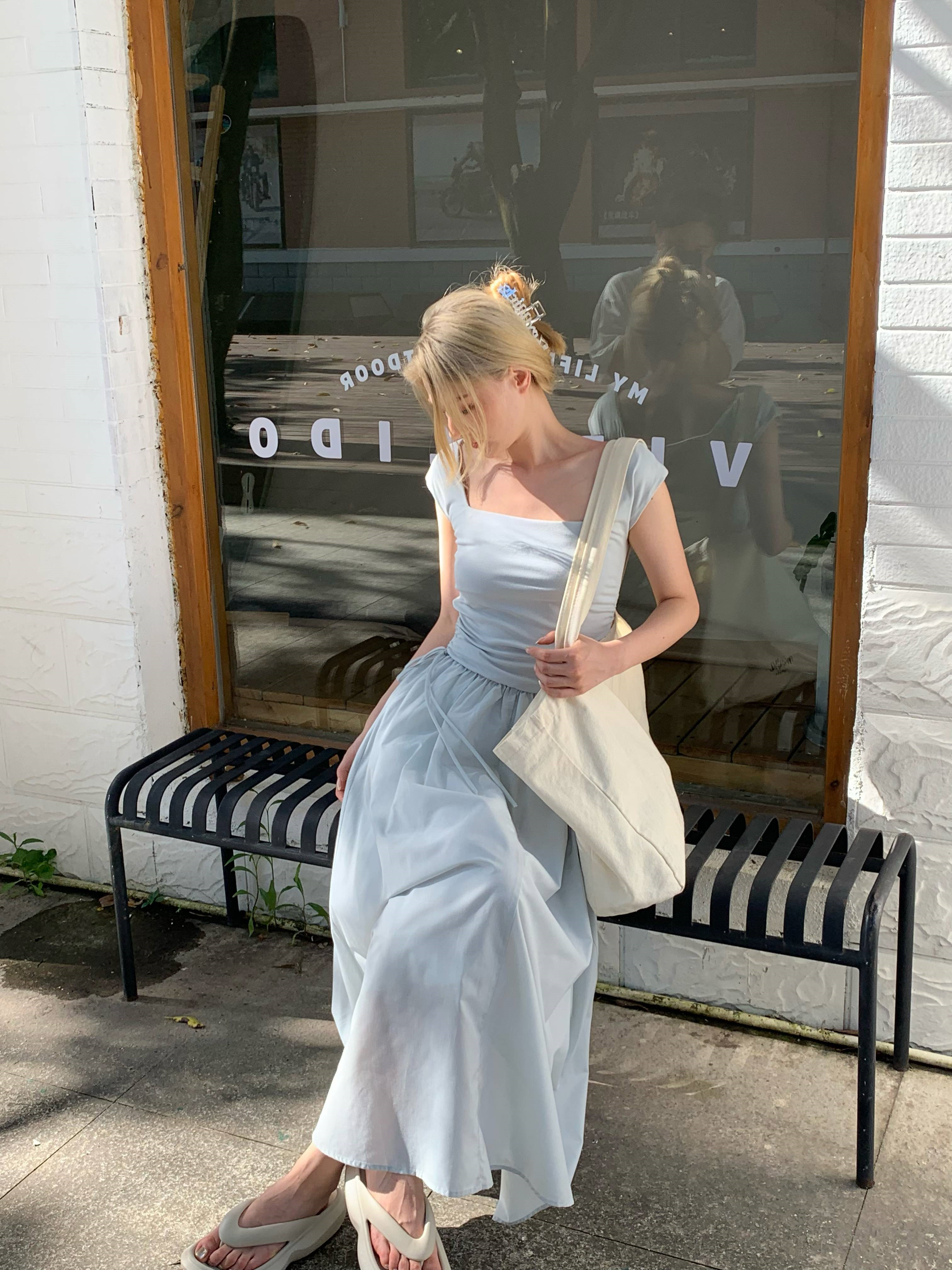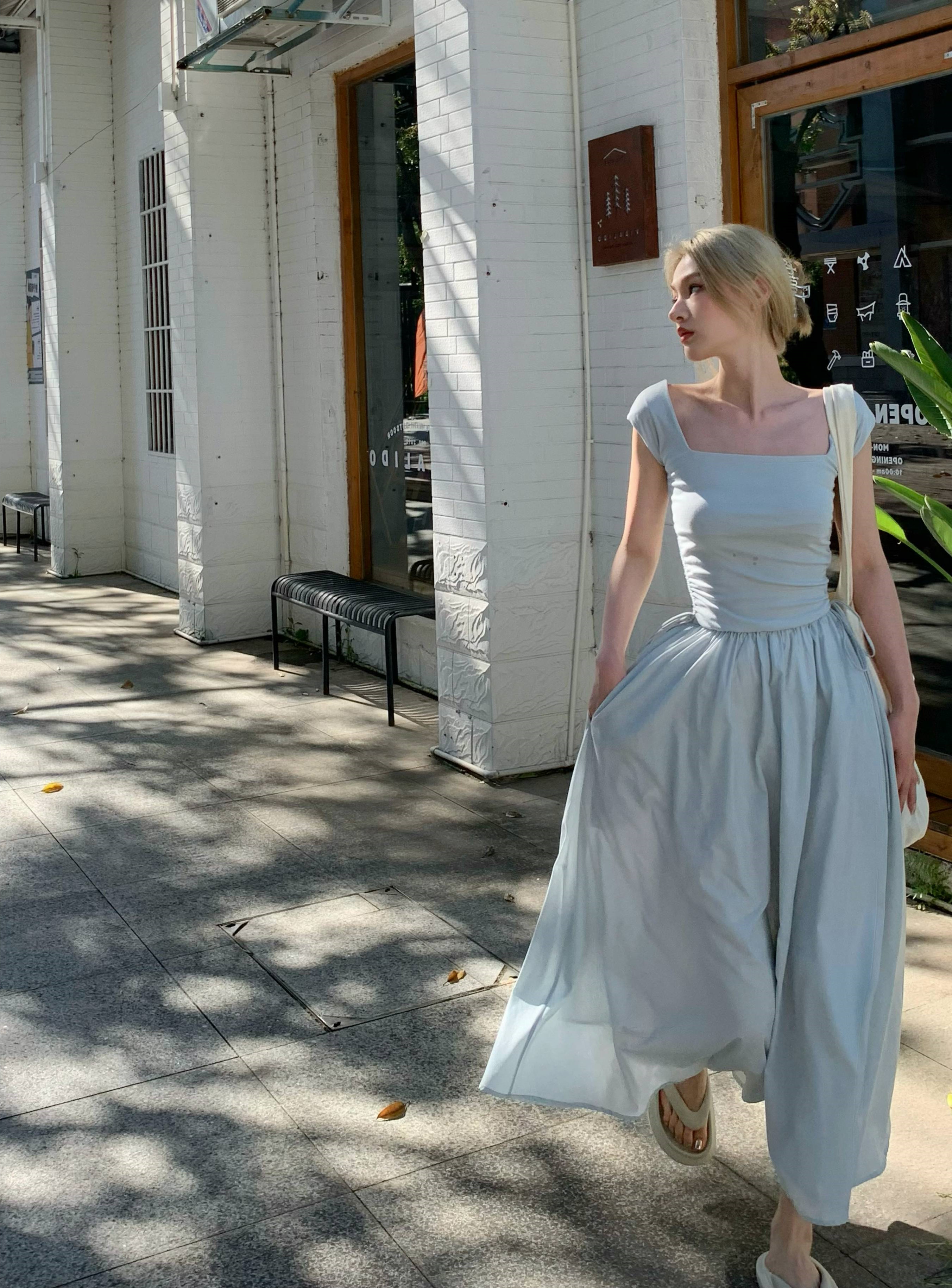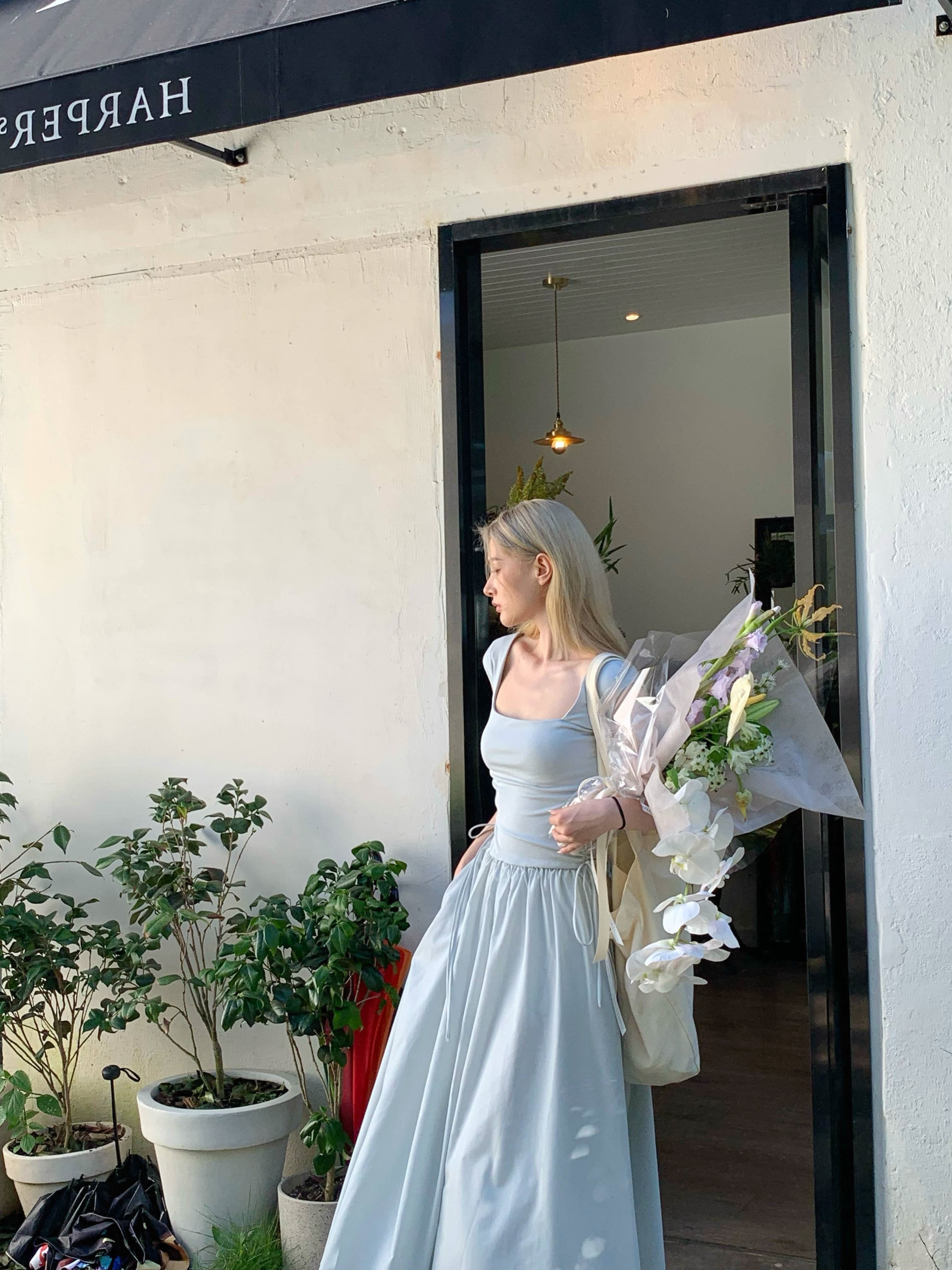 Gray -blue waist sleeveless;White brace
