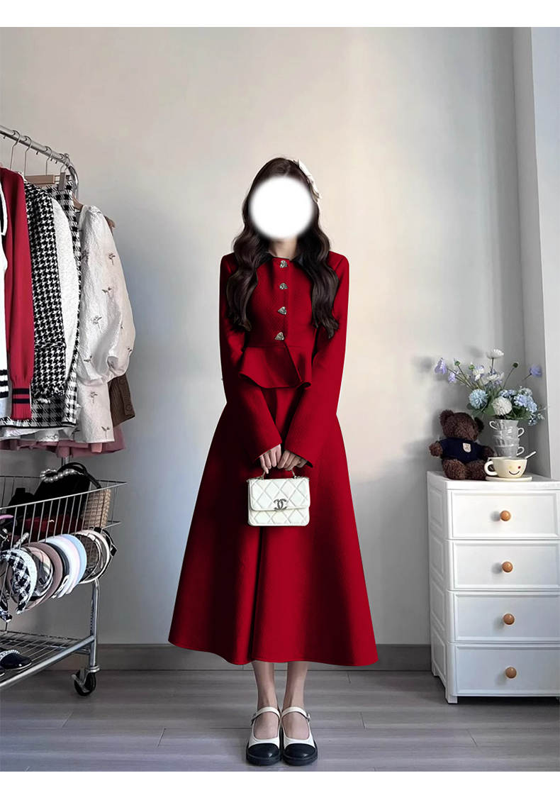 - Color: Burgundy top, skirt