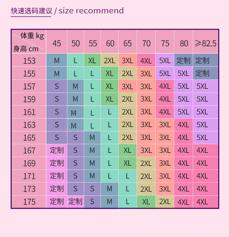 M suitable for 95-105 catties;L suitable for 105-115 catties;XL is suitable for 115-125 catties;XXL is suitable for 125-135 catties;XXXL is suitable for 135-145 catties;4XL is suitable for 145-155 catties