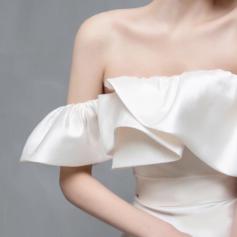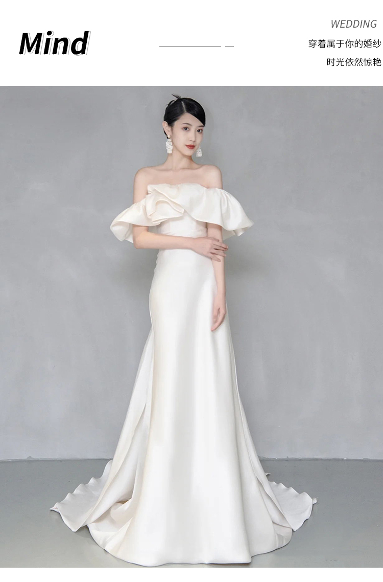 Wedding dress for bride, open shoulders, bright catchy style, fitted, lace dress