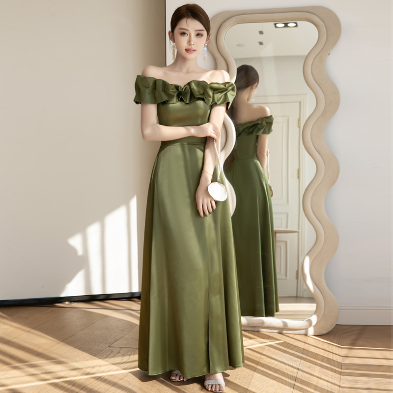 Green, long, V-neckline, open shoulders, lifting effect, mid-length, champagne color